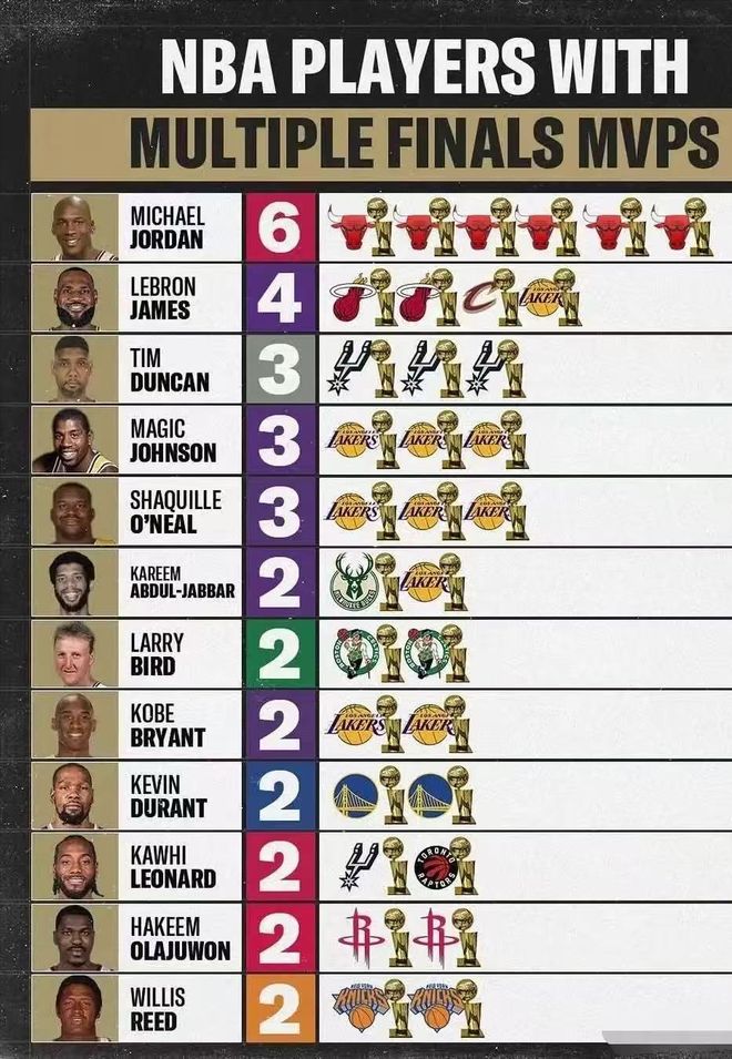 NBA历史上漫漫长河,一个人拿下至少2个FMVP的,却一共只有12个人。今天笔者就来盘点一下,这12位神人,以及他们与FMVP之间的的故事。拿2个FMVP有多难?历史仅12人做到,老詹独一份,库里