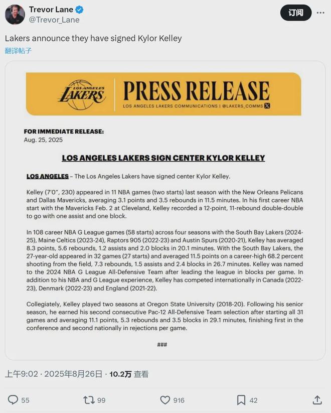 北京时间8月26日,洛杉矶湖人官方宣布:正式签下中锋凯勒-凯利。这是一份Exhibit 10 合同,也就是训练营合同。签下Exhibit 10合同的球员,如果赛季开始之前被裁,最多能拿到8.53万美