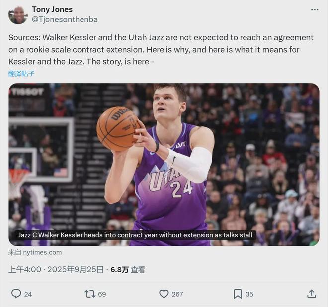凯斯勒目前是4年1337万美元的新秀合同,2026年夏天到期,下赛季薪水只有488万美元。凯斯勒说:“我真的很爱犹他,如果能留在爵士,我会非常感激。”爵士已经给凯斯勒开出了续约报价,只是双方分歧太大,无法达成一致。