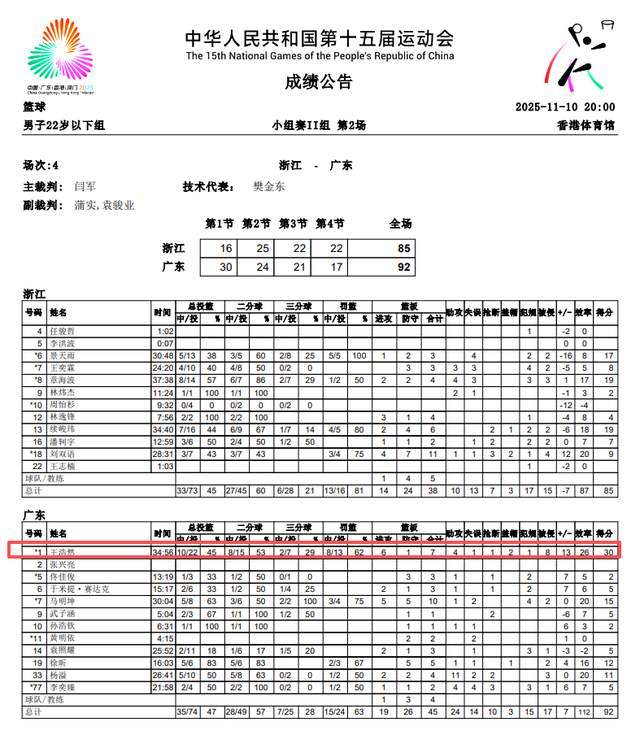 十五运U22男篮项目的比赛也已经全面开打,在11月10日晚上,东道主广东U22男篮迎来小组赛首秀,对阵实力强劲的浙江U22男篮。经过4节较量,广东U22男篮技高一筹,以92-85击败对手,拿到开门红。广东队取胜的第一功臣,那就非王浩然莫属了。感谢杜锋在过去的夏天带着王浩然练级,才使得这位21岁的小将脱颖而出,首秀就爆砍30分7篮板4助攻,十分勇猛。