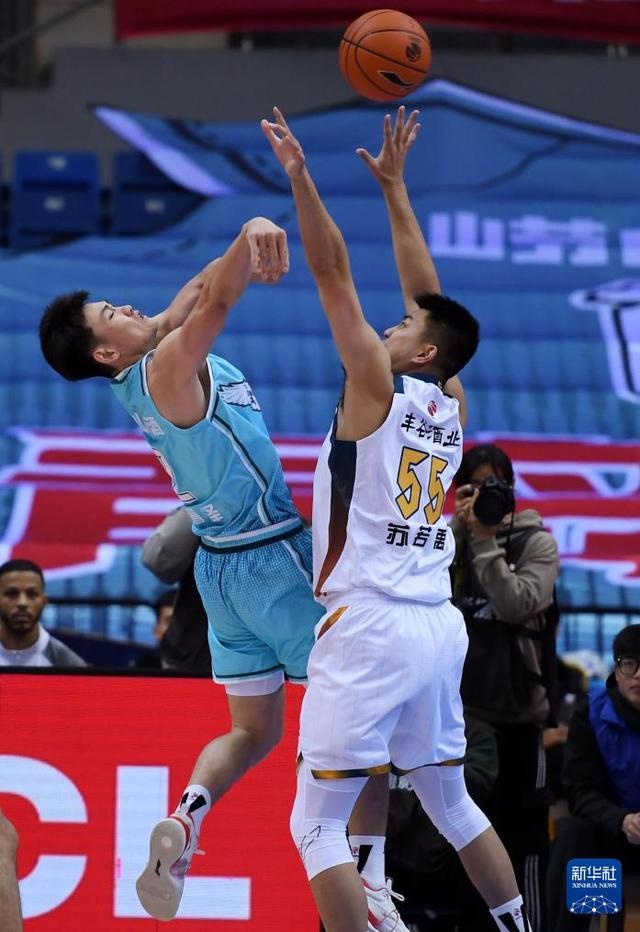 12月15日,四川丰谷酒业队球员苏若禹(右)在比赛中防守青岛崂山啤酒队球员王睿泽投篮。新华社记者 李紫恒 摄