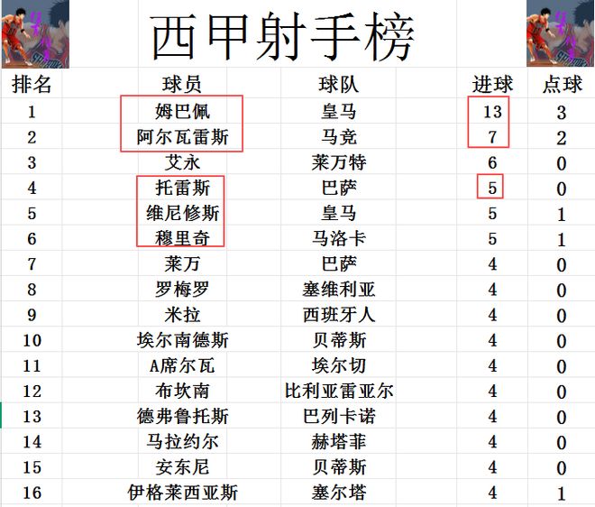 射手榜方面,姆巴佩气势如虹,13球高居榜首,阿尔瓦雷斯落后姆巴佩6球排在第2,艾永6球排在第3。托雷斯今天打入一球,追上维尼修斯和穆里奇,三人5球并列第4。莱万,安东尼,马拉约尔,A席尔瓦等人4球刚好挤入前十。