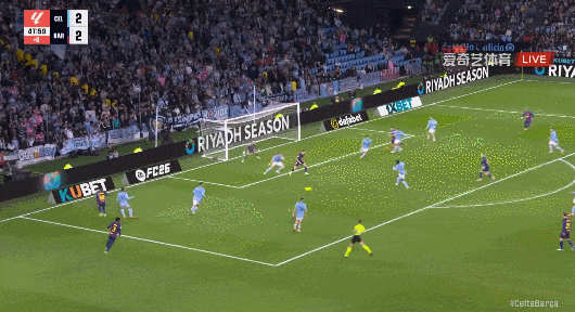 紧追皇马!巴萨客场4比2塞尔塔 37岁莱万戴帽亚马尔建功